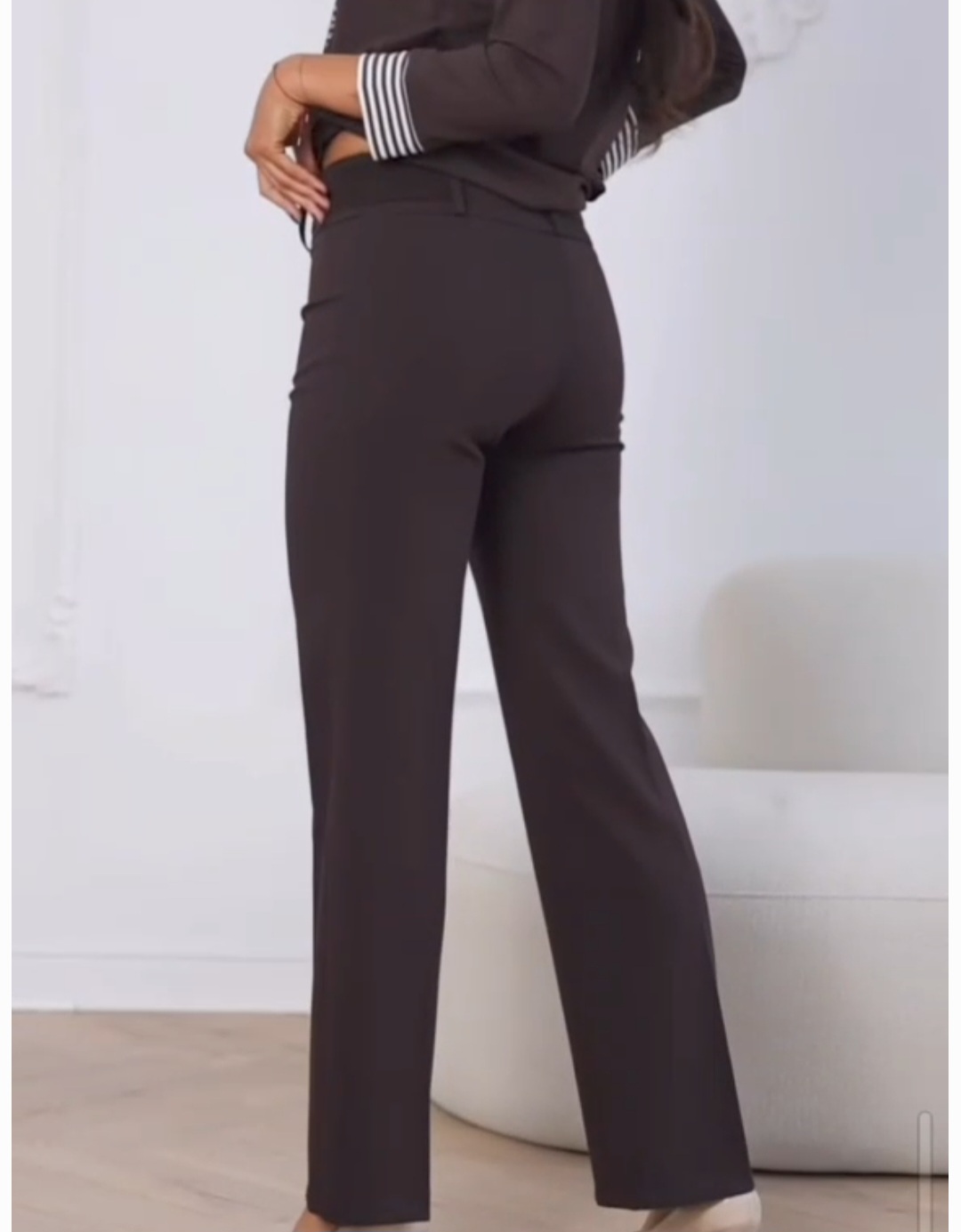 Eleganckie spodnie w głębokim, czekoladowym odcieniu, uszyte z wysokiej jakości, przyjemnego w dotyku materiału. W pasie posiadają szlówki oraz dodatkowy pasek z elegancką ozdobą, który podkreśla styl i charakter modelu. Klasyczny, prosty krój z kantem optycznie wysmukla sylwetkę i nadaje spodniom ponadczasowy wygląd. Idealne na formalne okazje, do pracy lub stylowych codziennych stylizacji.