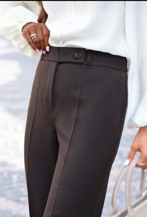 Stylowe, klasyczne spodnie w kolorze gorzkiej czekolady. Model z prostą nogawką i eleganckim kantem, który optycznie wysmukla sylwetkę. Spodnie mają wygodny pasek w talii oraz praktyczne kieszenie po bokach, dzięki czemu łączą w sobie elegancję i komfort noszenia.