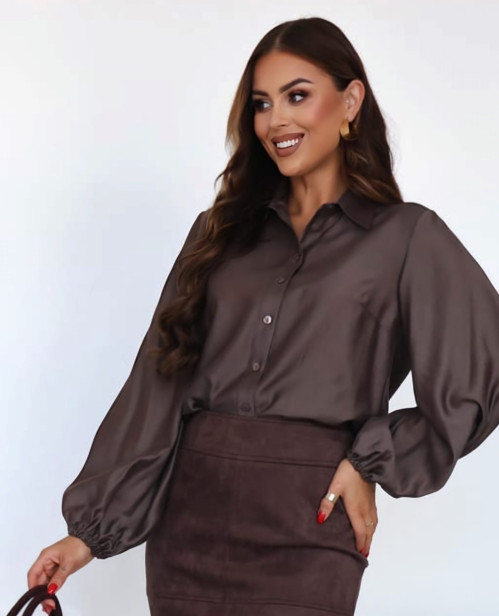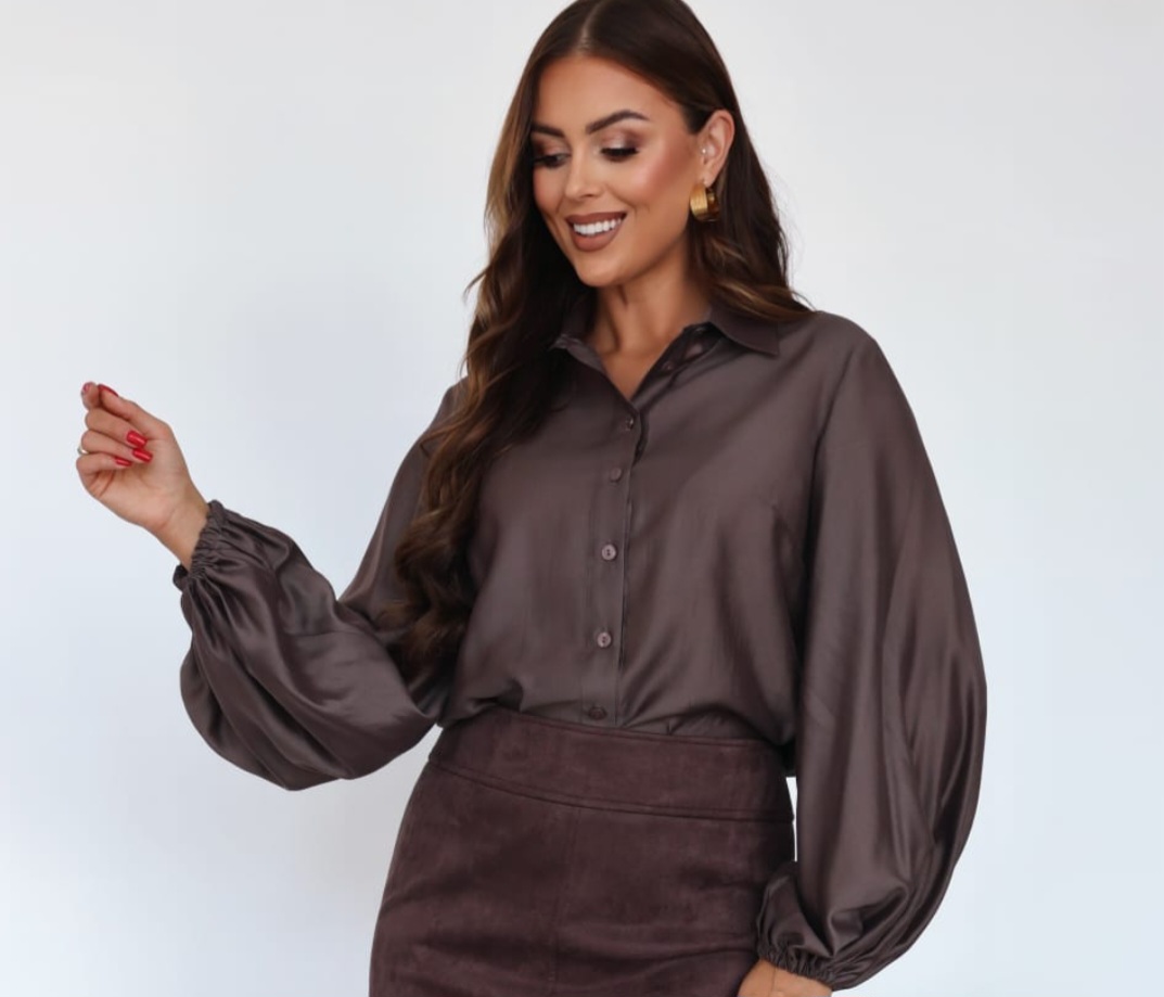 Stylowa koszula zapinana na guziki, uszyta z tkaniny o delikatnym, subtelnym połysku. Model wyróżnia się klasycznym kołnierzykiem oraz efektownymi rękawami zakończonymi gumką, które tworzą lekko bufowany, rozszerzający się dół. Brązowy kolor nadaje całości ciepły, elegancki charakter, idealny zarówno do stylizacji codziennych, jak i bardziej formalnych.
