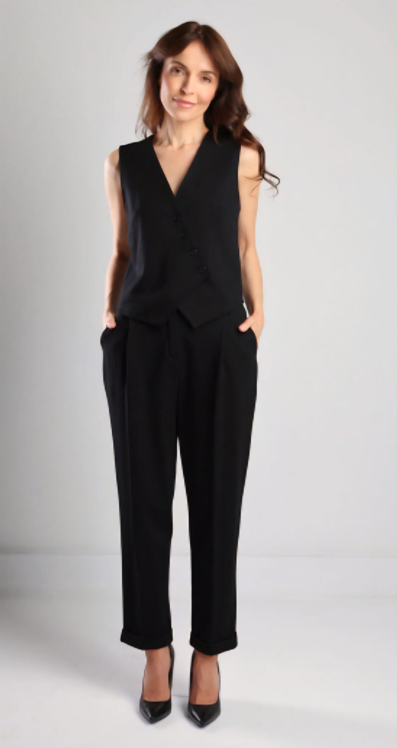 Model ma długie nogawki i idealnie komponuje się z dopasowaną kamizelką, tworząc spójny, stylowy komplet.