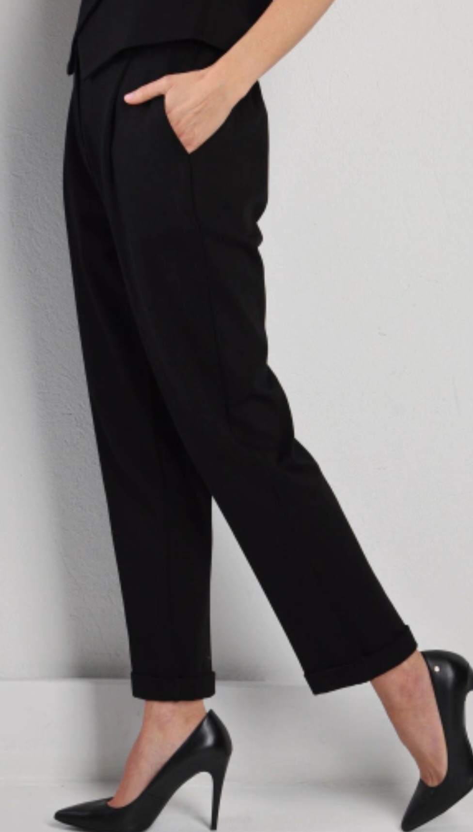 Z przodu znajdują się efektowne zakładki, które dodają spodniom charakteru i eleganckiego układu. Spodnie są zapinane na suwak i guzik, a dwie kieszenie z przodu podnoszą ich praktyczność. Dół nogawek wykończono przyszytym mankietem, co nadaje całości nowoczesny, dopracowany wygląd.