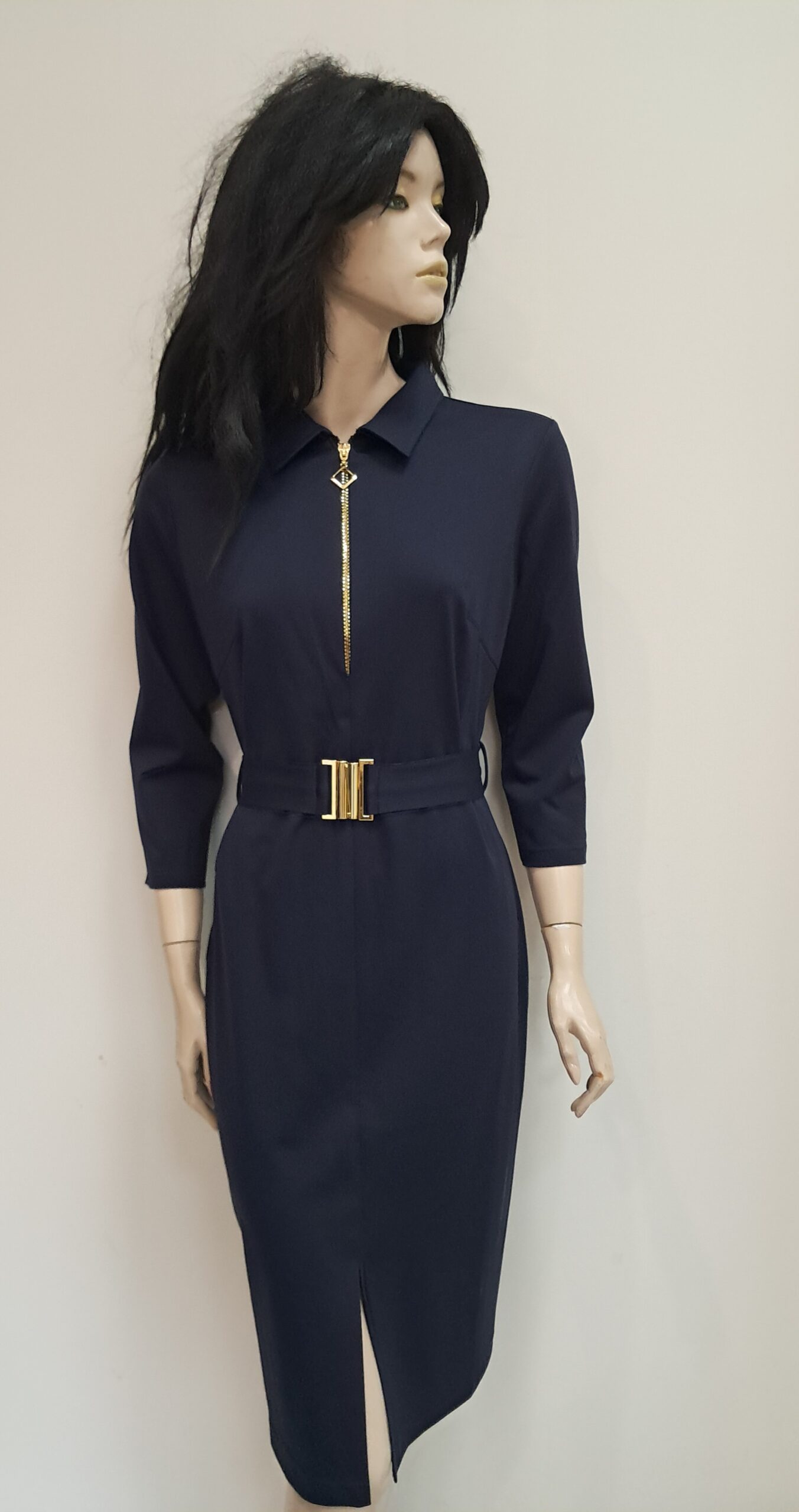 Elegancka sukienka w kolorze granatowym to idealna propozycja zarówno na co dzień, jak i na specjalne okazje. Model posiada klasyczny kołnierzyk oraz rękawy sięgające za łokieć, co dodaje jej ponadczasowego charakteru. Dekolt zapinany na zamek błyskawiczny pozwala regulować głębokość wycięcia – w zależności od okazji.