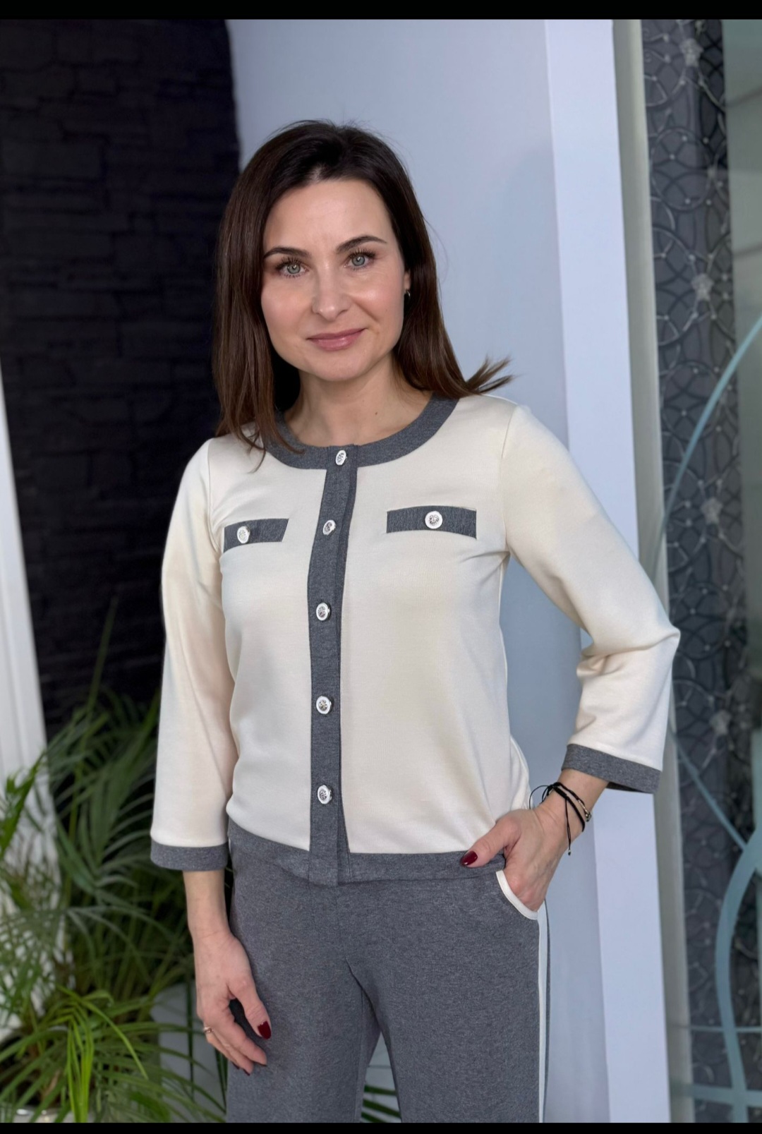 Szerokie spodnie w odcieniu popielatym, ozdobione waniliowym lampasem po bokach, nadają całości lekko sportowego, a jednocześnie szykownego charakteru.