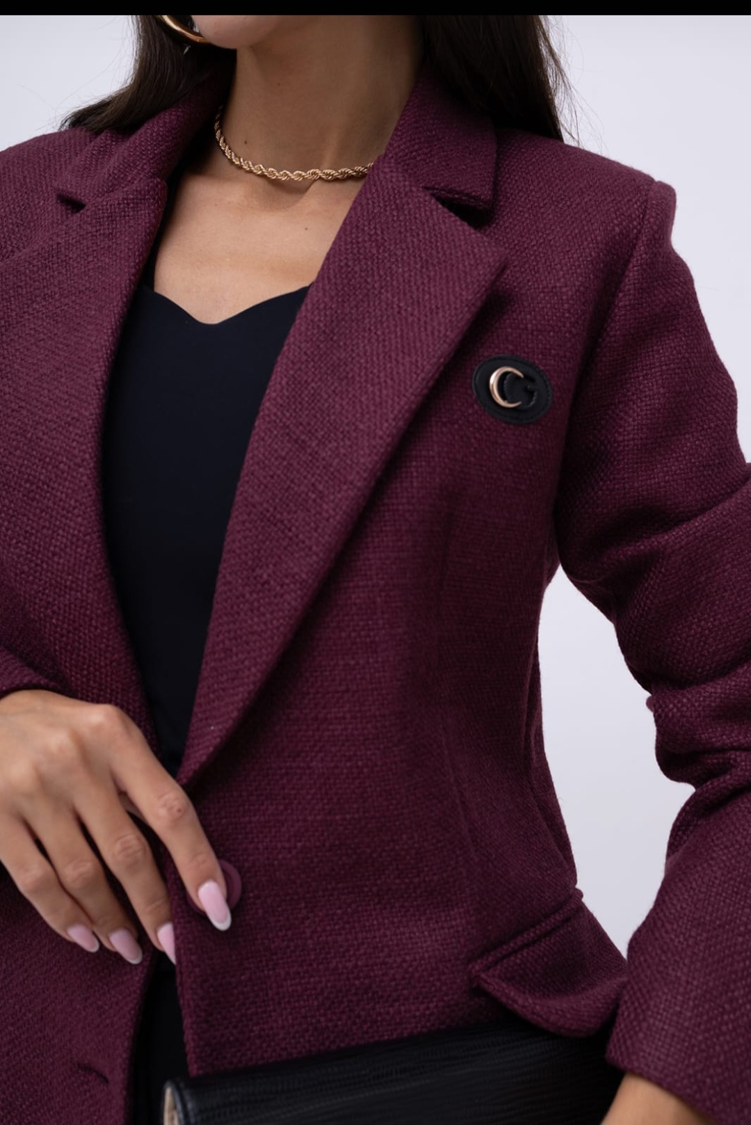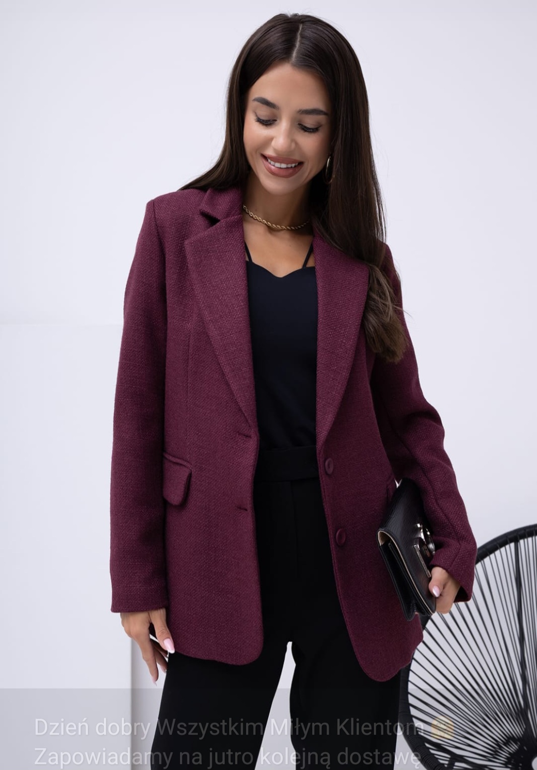 Stylowa marynarka w głębokim odcieniu burgundu, która zachwyca klasyką i nowoczesną formą. Model o wydłużonym kroju, zapinany na dwa guziki, doskonale podkreśla sylwetkę i dodaje szyku każdej stylizacji. Po bokach znajdują się praktyczne kieszenie z patkami, a wnętrze wykończono podszewką dla pełnego komfortu i elegancji.