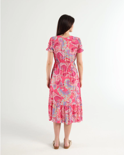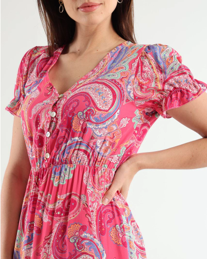 Różowa sukienka z wiskozy w paisley to lekka i kobieca propozycja o swobodnym charakterze. Model posiada odcięcie pod biustem oraz elastyczny ściągacz, dzięki czemu pięknie dopasowuje się w górnej części i delikatnie rozszerza ku dołowi, tworząc zwiewną, rozkloszowaną linię. Wzór paisley oraz falbaniaste wykończenie podkreślają jej długość za kolano i nadają całości romantycznego wyrazu.