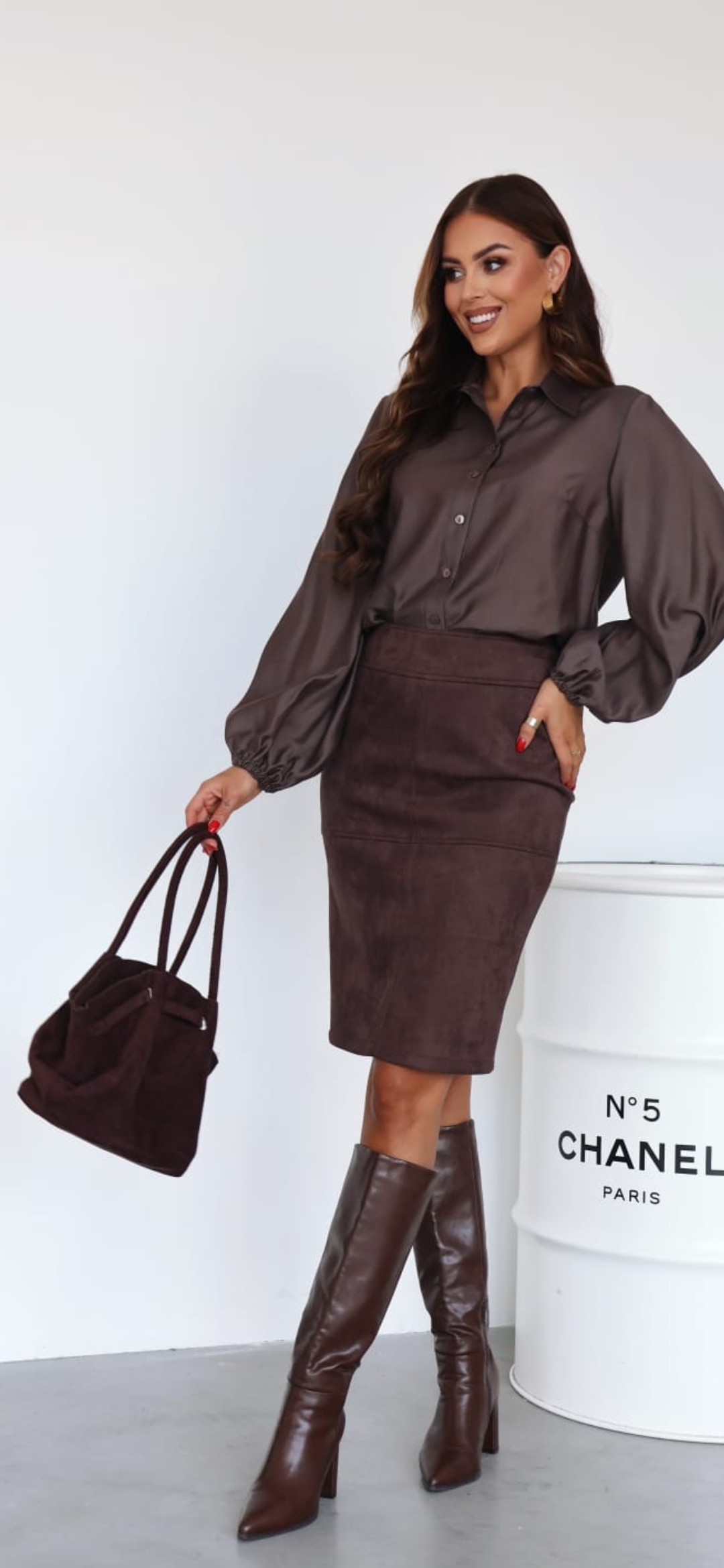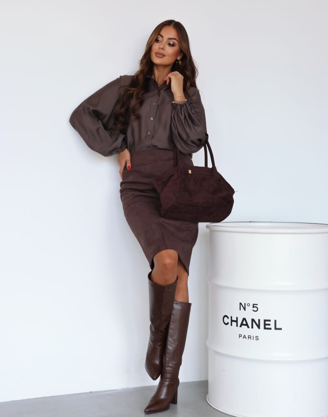 Stylowa spódnica w głębokim, czekoladowym odcieniu, uszyta z wyjątkowo miękkiego materiału typu skórka brzoskwini, który jest przyjemny w dotyku i pięknie układa się na sylwetce. Klasyczny, kobiecy krój przed kolano sprawdzi się zarówno na co dzień, jak i w eleganckich stylizacjach.