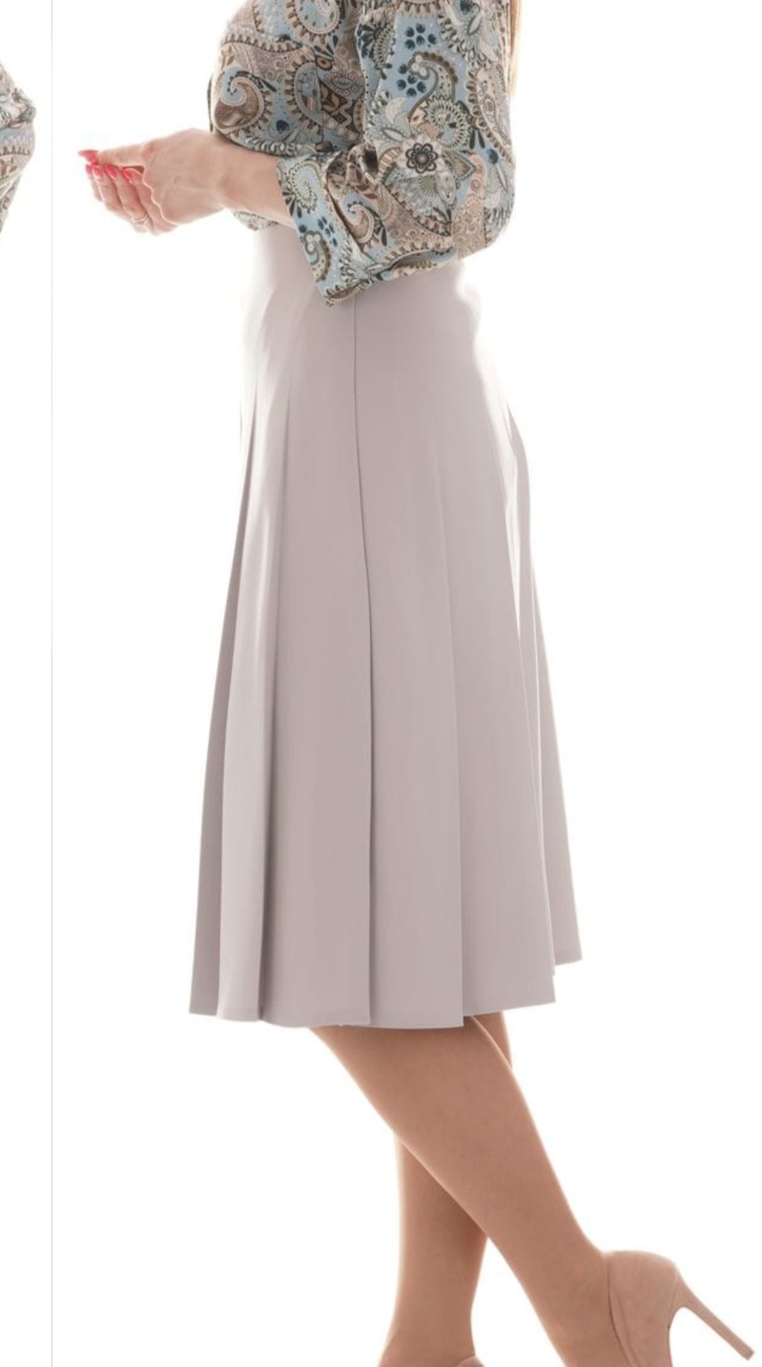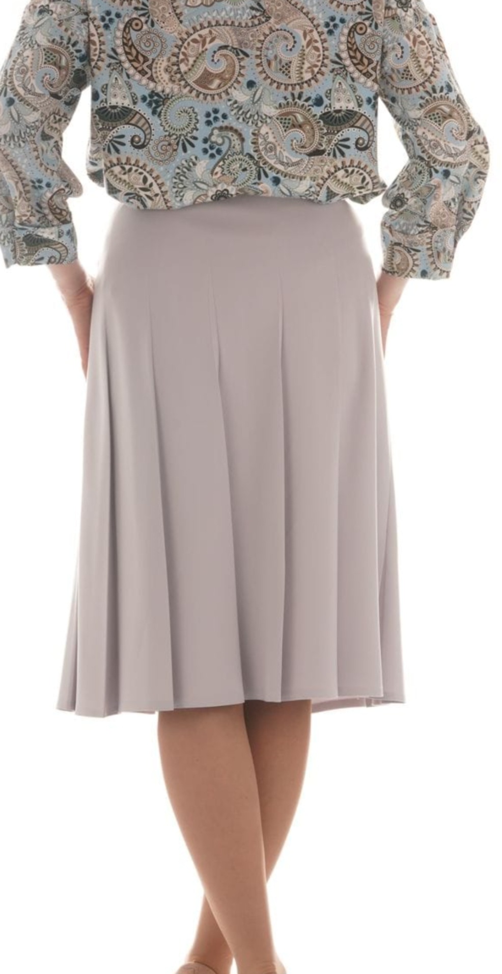 Stylowa spódnica Margowik w jasnym odcieniu popielu to doskonała propozycja dla kobiet ceniących klasykę i komfort. Model o długości za kolano pięknie układa się na sylwetce, podkreślając jej naturalne proporcje.