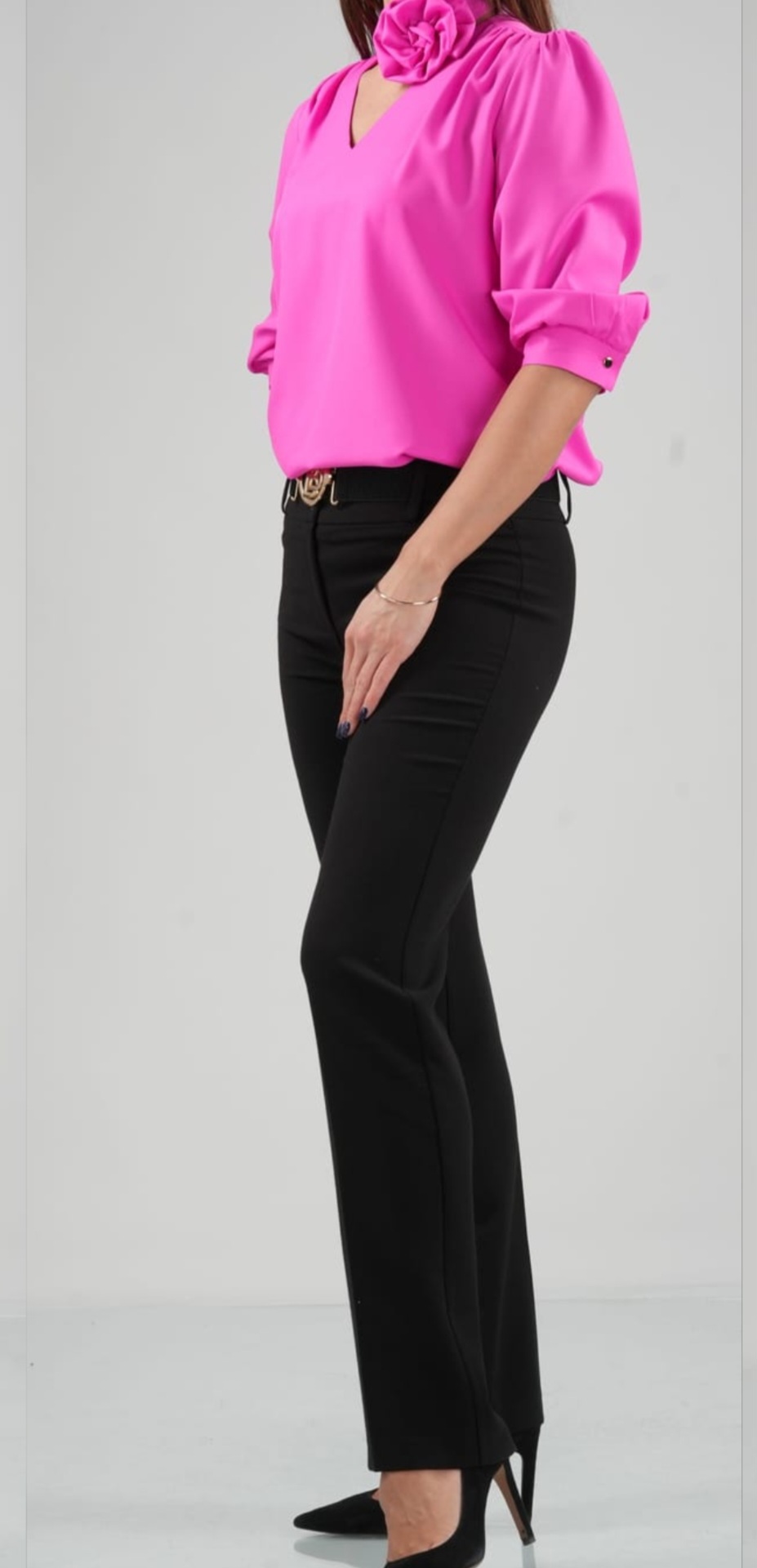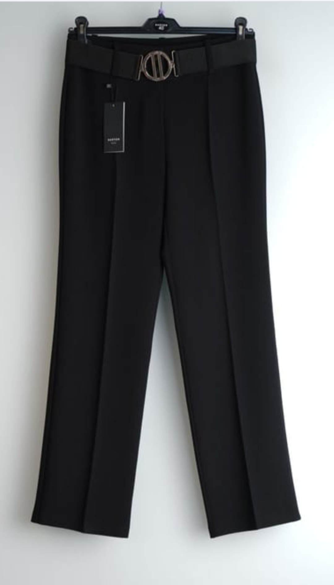 Czarne spodnie Barton z paskiem. Eleganckie spodnie na kant, zapinane w pasie na dwa guziki. Posiadają szlówki oraz rozciągliwy pasek, który zapewnia lepsze dopasowanie i wygodę noszenia. Prosty krój nogawek sprawia, że spodnie prezentują się bardzo elegancko i klasycznie. Idealne na różne okazje – zarówno do pracy, jak i na bardziej formalne wyjścia.
