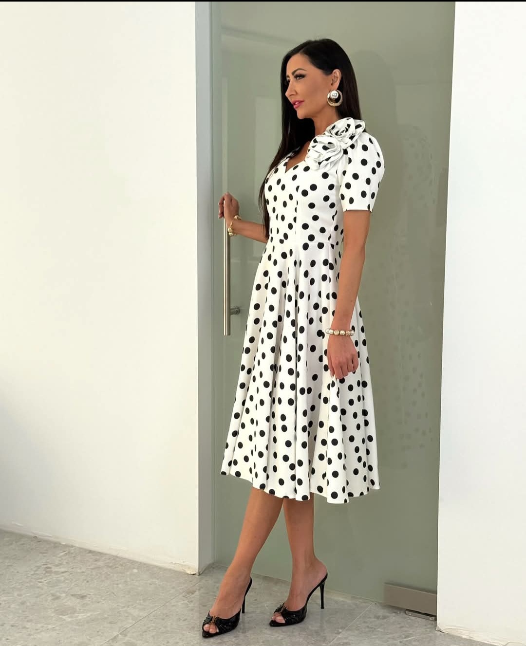 Klasyczny print w grochy i rozkloszowany fason sprawiają, że sukienka prezentuje się niezwykle elegancko i kobieco. Dopasowana góra pięknie podkreśla sylwetkę, a lekki dół pracuje w ruchu, dodając stylizacji lekkości i dziewczęcego uroku. To idealna propozycja na komunię, przyjęcia oraz wszystkie wiosenne okazje.