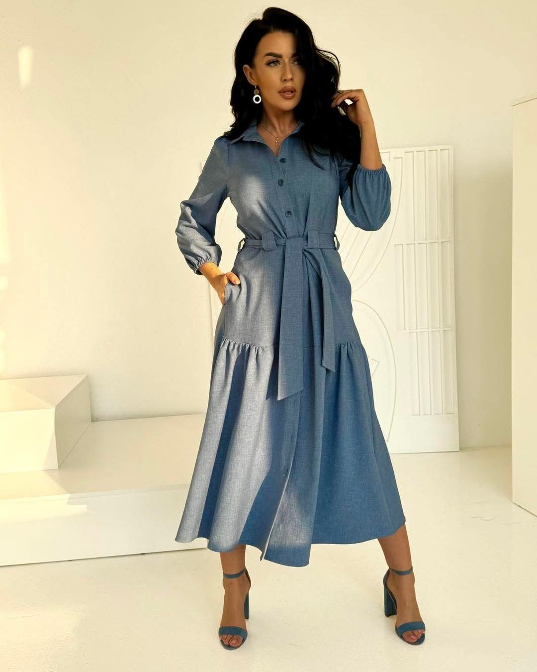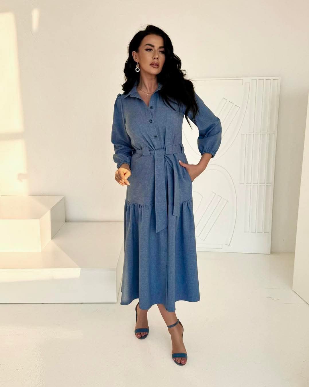 Sukienka w kolorze ciemnego jeansu to stylowa i ponadczasowa propozycja dla kobiet ceniących wygodę oraz elegancki, casualowy charakter. Model z klasycznym kołnierzykiem i rękawem sięgającym za łokieć prezentuje się niezwykle kobieco i uniwersalnie.