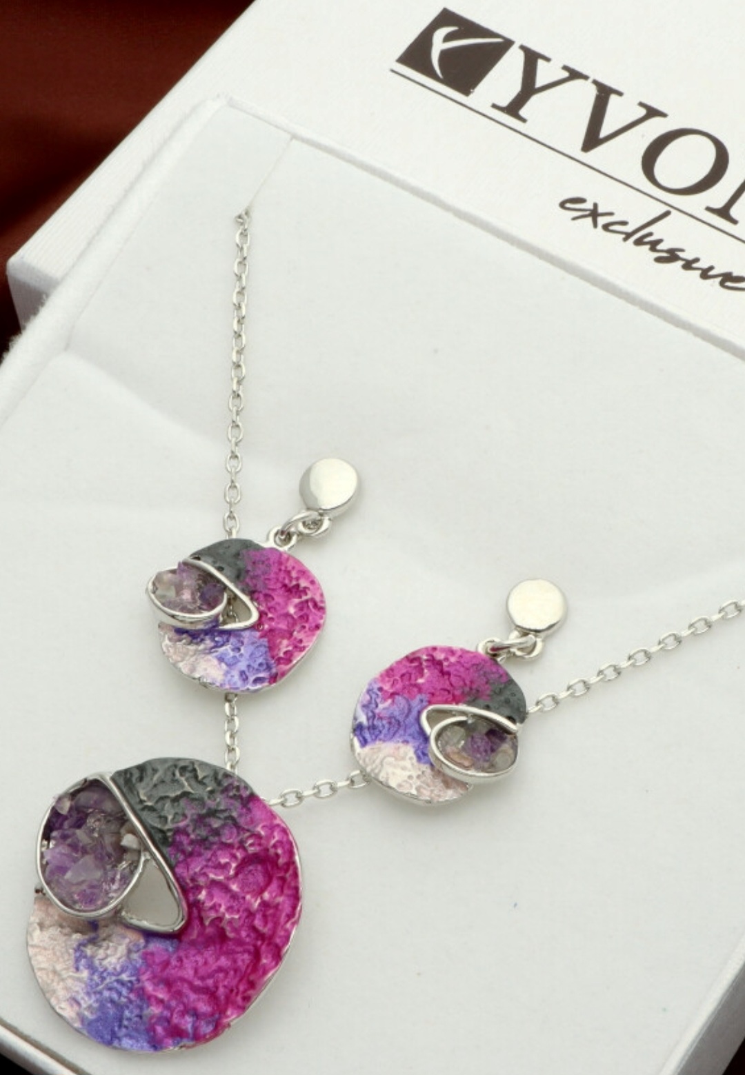 Uroczy zestaw składający się z krótkiego naszyjnika i pasujących kolczyków to propozycja dla kobiet ceniących wyjątkowe, ręcznie wykonane dodatki. Biżuteria jest ręcznie emaliowana, a subtelny efekt OMBRÉ nadaje jej niepowtarzalnego charakteru i głębi kolorów.