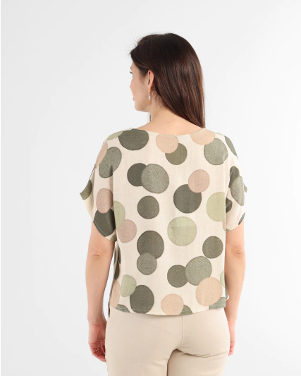 Wiskozowa bluzka w odcieniach zieleni i beżu to propozycja o lekkim, swobodnym charakterze. Prosta linia została podkreślona dużym, nieregularnym deseniem w formie kół, który nadaje całości nowoczesnego wyrazu. Gładko poprowadzona góra oraz luźniejszy krój sprawiają, że bluzka układa się naturalnie i zapewnia komfort noszenia.